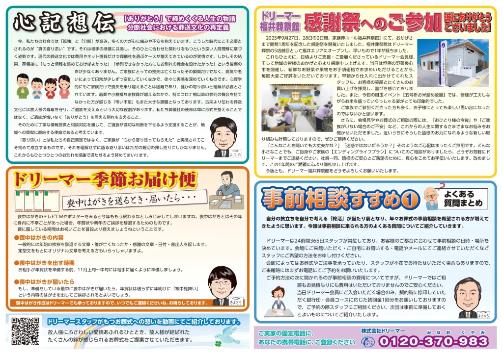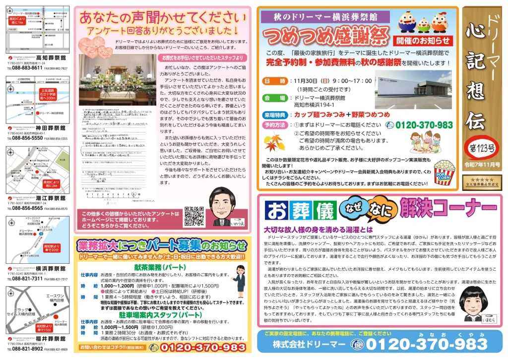 【葬儀かわら版】第123号を発行しました 葬儀かわら版第123号を発行しました 高知市を中心にお葬儀や法要の知っておくと為になる豆知識や、葬祭スタッフの近況など色々な情報を掲載しておりますので是非ご覧ください。 前の記事へ