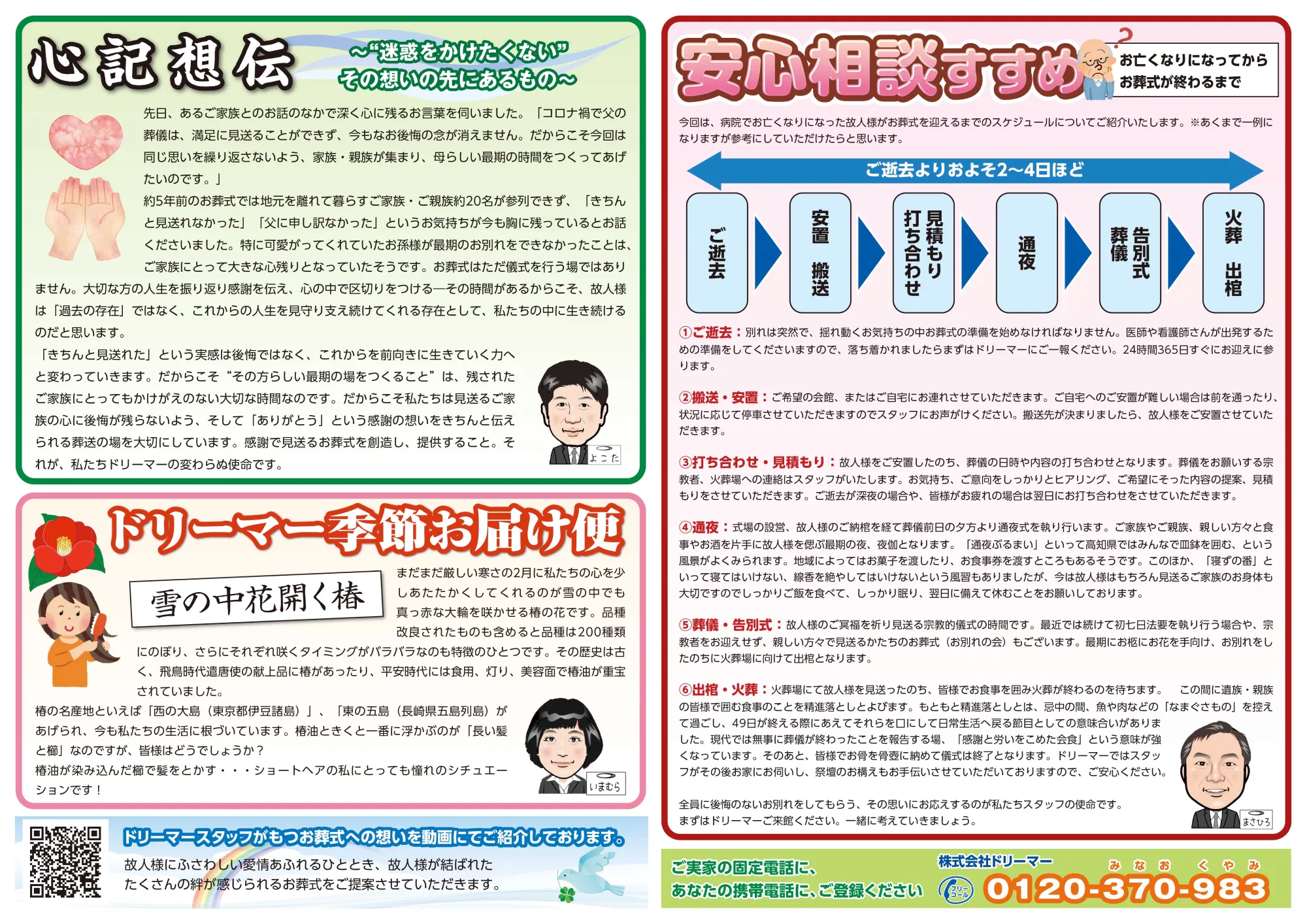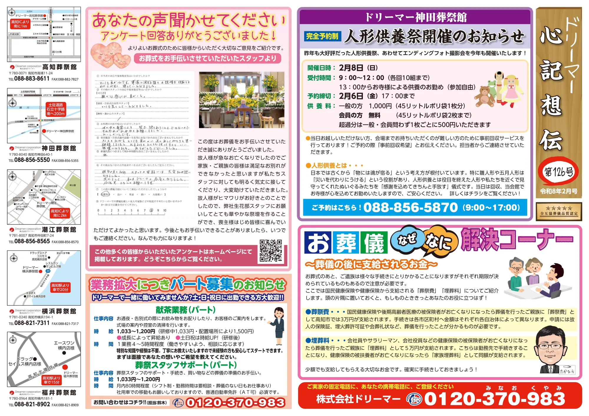 【葬儀かわら版】第126号を発行しました 葬儀かわら版第126号を発行しました 高知市を中心にお葬儀や法要の知っておくと為になる豆知識や、葬祭スタッフの近況など色々な情報を掲載しておりますので是非ご覧ください。 前の記事へ